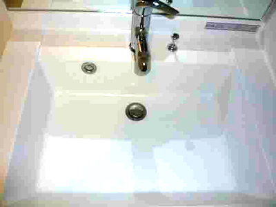 人造大理石天板一体ボウルで、万が一化粧ビンなどを落としても割れにくいです。
