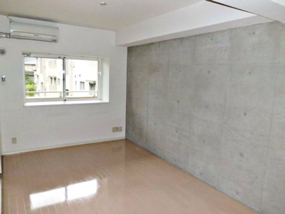 片面コンクリートデザインのリビング。床は明るいベージュ系です。