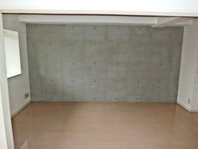 片面コンクリートデザインのリビング。床は明るいベージュ系です。